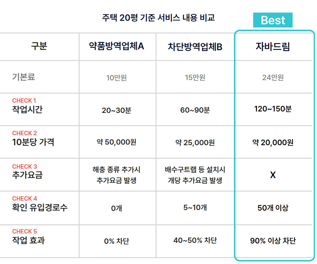 내구성 좋은 소재를 활용해 물리적으로 통로를 막는 시공이기 때문에 효과가 반영구적입니다. 계속 뿌려줘야 하는 화학 살충제와 지속효과 측면에서 큰 차이가 있습니다.